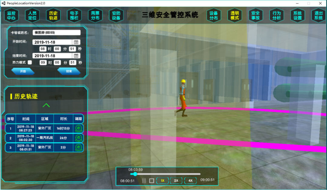 歷史軌跡通過單人、多人以及熱力圖模式對(duì)歷史軌跡進(jìn)行查詢。多維度數(shù)據(jù)及查看方式方便變電站管理人員對(duì)位置歷史數(shù)據(jù)進(jìn)行有效分析和利用。