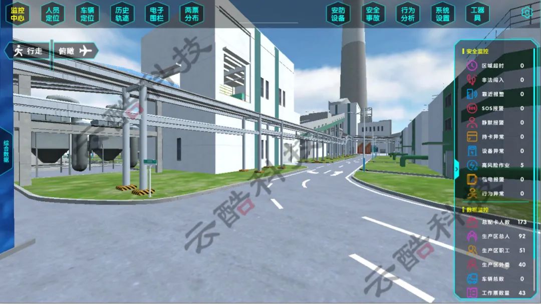 廠內(nèi)需要定位的車輛配備GPS/北斗雙模定位設(shè)備,系統(tǒng)后臺實(shí)時監(jiān)測車輛位置并在三維地圖上進(jìn)行顯示,車輛定位可聯(lián)動視頻監(jiān)控和歷史軌跡播放。