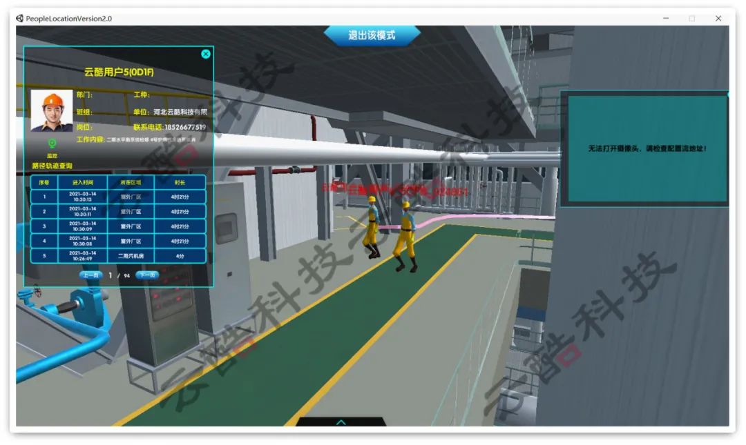 當(dāng)作業(yè)人員攜帶電子標(biāo)簽在現(xiàn)場作業(yè)時,系統(tǒng)后臺會實(shí)時解算人員位置并在二維/三維地圖上顯示。被定位的人員支持按人員類型分顏色顯示,按人員類型顯示和隱藏,并根據(jù)實(shí)時定位,具有區(qū)域人員統(tǒng)計、區(qū)域進(jìn)出統(tǒng)計、身份識別等功能。